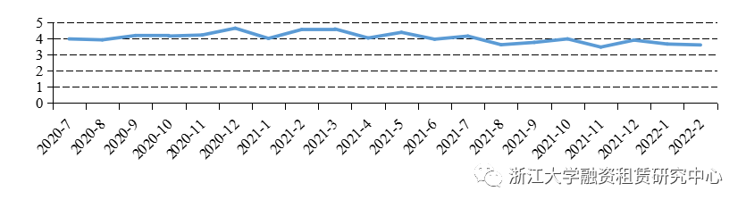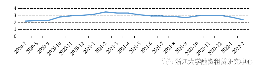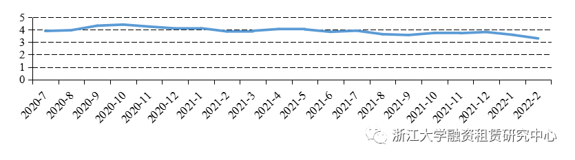 在發行利率方面,2022年2月融資租賃公司公司債平均發行利率為3.61%,環比下降6個BP,同比下降96個BP。其中中航國際租賃有限公司2022年面向專業投資者公開發行公司債券(第二期)和平安國際融資租賃有限公司2022年公開發行公司債券(第三期)(品種一)票面利率最低,均為3.20%,發行期限分別為5年和4年;中飛租融資租賃有限公司2022年面向專業投資者非公開發行公司債券(第一期)票面利率最高,為4.40%,發行期限為3年。