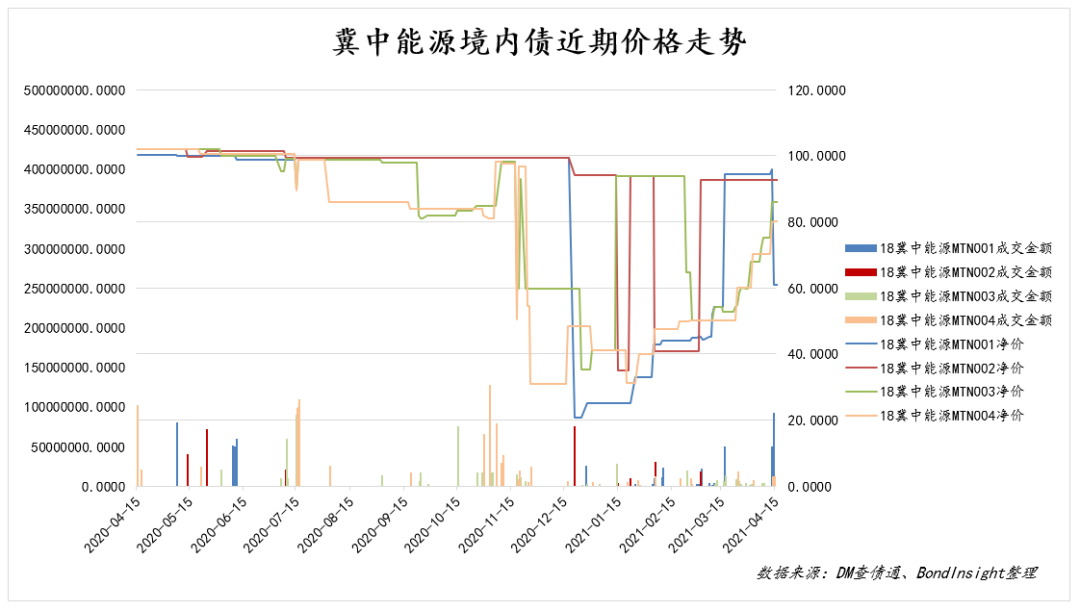 18冀中能源MTN004 (101801319.IB):截至目前,該債收盤凈價為80.1元,較上一筆收盤價70.2上漲14.10%。從走勢來看,該債券自2020年11月末驟跌至歷史最低價31元后價格緩慢攀升,于今年三月末發(fā)生價格三連跳,收盤凈價在20天內自50.2元回升至80.1水平。成交收益率下降至47.78%,偏離中債估值1,376.11bps。截至4月15日收盤,4月成交額共0.3103億元。