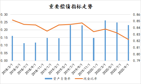 公司2020年三季度總資產(chǎn)2,277.05億,未將永續(xù)債調整入表前,三季度總負債較年初下降2.49%至1,855.96億元,資產(chǎn)負債率下降至81.51%,為近三年最低值。將永續(xù)債調整入表后,總負債較之前增加3.51%至1,921.15億,資產(chǎn)負債率升高至84.37%,幾乎與2018年末持平。