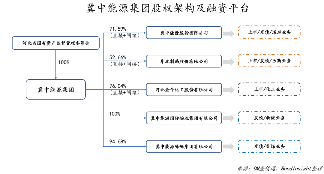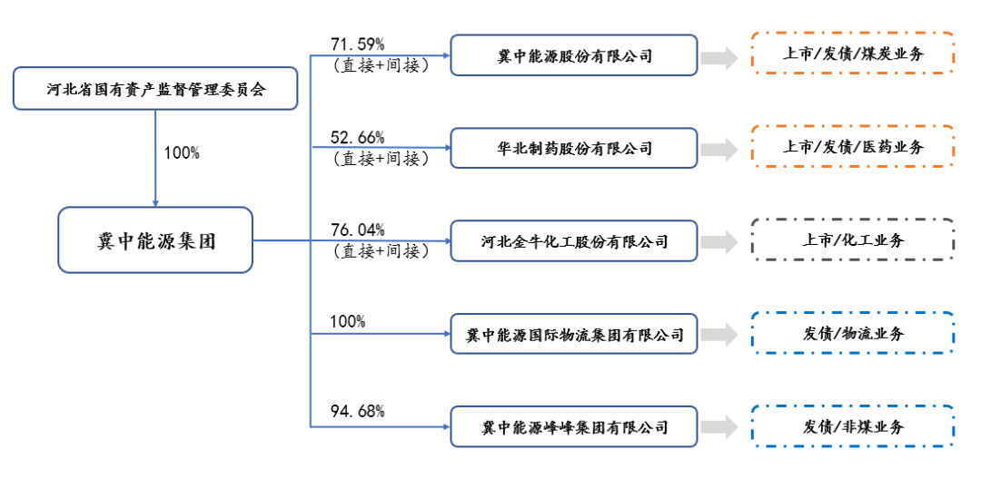 公司旗下?lián)碛腥疑鲜凶庸荆謩e為冀中能源股份有限公司(股票簡稱“冀中能源”,股票代碼“000937.SZ”,以下簡稱“冀中股份”)、華北制藥股份有限公司(股票簡稱“華北制藥”,股票代碼“600812.SH”)和河北金牛化工股份有限公司(股票簡稱“金牛化工”,股票代碼“600722.SH”)。截至2020年11月末,公司以直接和間接方式持有上述上市子公司的股權比例分別為71.59%、52.66%和76.04%,三者分別是公司煤炭業(yè)務、醫(yī)藥業(yè)務和非煤化工業(yè)務的經(jīng)營主體。