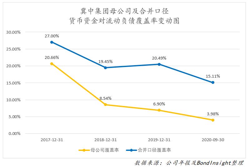 在現(xiàn)金層面,冀中集團貨幣資金對流動負債覆蓋率一路猛跌。從母公司口徑來看,在2017年末,公司貨幣資金尚能覆蓋20.66%的流動負債,但截至2020年Q3,母公司流動負債已增長至657.93億,可支配資金僅為26.19億,覆蓋率僅剩3.98%。從合并口徑出發(fā),2020年Q3公司賬上貨幣資金達163.54億元,覆蓋率仍有15.11%。截至2021年4月,集團存續(xù)債券規(guī)模為234.7億,貨幣資金缺口較大。