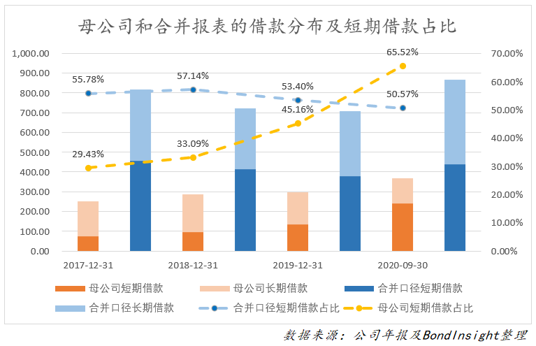 2020年三季度公司借款總和較年初增長22.56%至866.66億元,其中長期借款增幅最為明顯,較年初增長29.99%至428億元,從金額匹配上看,以貸款方式兌付有息債券可能性較大。合并口徑下2020Q3短期借款占比下降至50.57%,公司長/短期借款分布較為均勻。但母公司口徑下,四年來短期借款占比以平均每年9%的速度增加,趨勢與合并口徑相反,集團增長的短期債務主要集中在母公司身上。