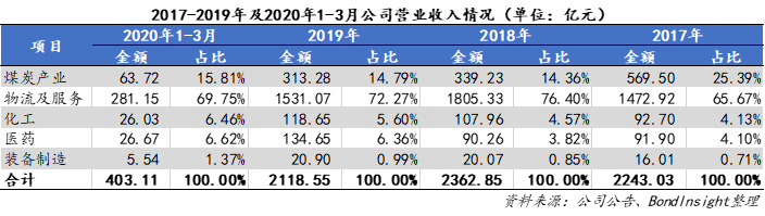 冀中能源目前已形成以煤炭產(chǎn)業(yè)為基礎,制藥、化工為支柱,機械制造、物流及服務業(yè)為支持的產(chǎn)業(yè)格局。整體來看,公司營業(yè)收入自2017年起緩慢下降,2017-2019年分別為2,243.03億元、2,362.85億元及2,118.55億元,下降約5.55%,主要為煤炭產(chǎn)業(yè)營收下降及物流服務板塊收入不穩(wěn)定所致。自2018年始,公司煤炭產(chǎn)業(yè)占營收比例已不足15%,物流及服務業(yè)占比超過70%,化工、醫(yī)藥及裝備制造體量較小,近年有所上升,但仍不足10%。