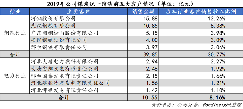 發(fā)行人煤炭主要銷往河北省、河南省、山西省、內蒙古、山東省及周邊地區(qū),下游客戶以華北、華中、華南地區(qū)的大型鋼廠、焦化廠、電廠為主,其中主要為大型鋼廠。2019年前五名鋼鐵客戶的銷售占比為30.77%;前五名電力客戶的銷售占比為8.16%,發(fā)行人與主要客戶合作關系穩(wěn)定,煤炭銷售規(guī)模有一定保障,主要客戶情況如下表所示: