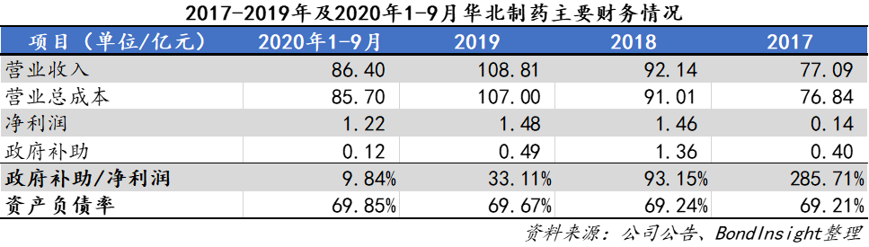 2017-2019年公司化學制劑藥和生物制劑收入持續(xù)提升,上升約41.15%,醫(yī)藥業(yè)務收入較快增長;但凈利潤未發(fā)生較明顯增幅,近三年均在1.5億元左右,其中2018年政府補助對凈利潤的覆蓋程度達到93.15%,雖逐年下降,公司對政府補助依賴性仍然較大,經(jīng)營效益差;公司資產(chǎn)負債率維持在69%,負債水平較高。主要財務情況如下表所示: