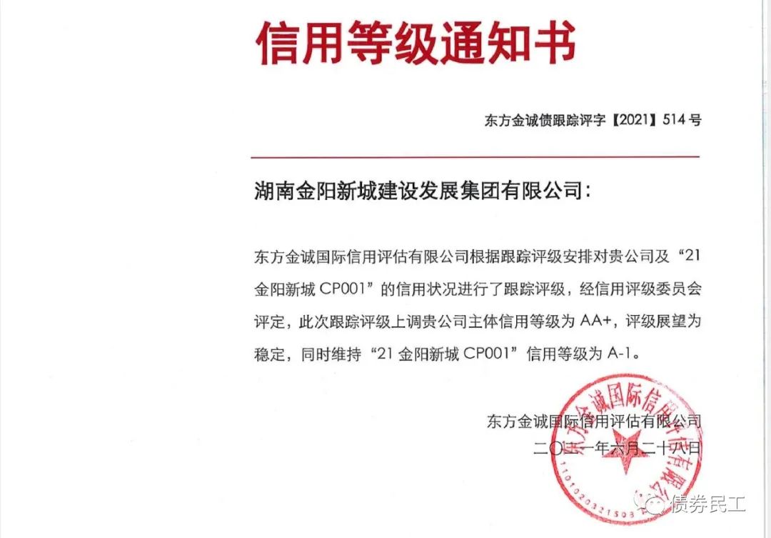 根據(jù)東方金誠2021年6月28日出具的跟蹤評(píng)級(jí)報(bào)告,湖南金陽新城建設(shè)發(fā)展集團(tuán)有限公司(以下簡稱“湖南新城建發(fā)”)的主體信用評(píng)級(jí)上調(diào)至AA+。本次評(píng)級(jí)上調(diào)的原因可能包括:長沙市和瀏陽市經(jīng)濟(jì)實(shí)力很強(qiáng)、瀏陽恒康等國有資產(chǎn)劃入、在資產(chǎn)注入和政府補(bǔ)貼方面得到實(shí)際控制人的支持等。