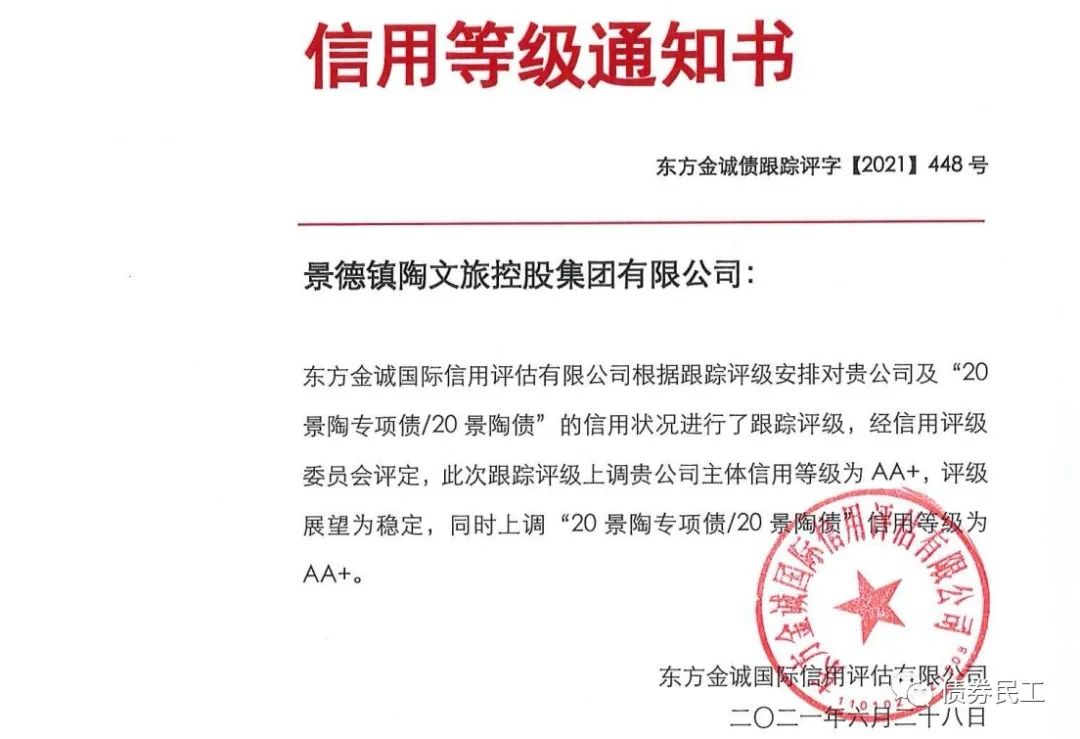 根據(jù)東方金誠2021年6月28日出具的跟蹤評(píng)級(jí)報(bào)告,景德鎮(zhèn)陶文旅控股集團(tuán)有限公司(以下簡稱“景德鎮(zhèn)陶文旅”)的主體信用評(píng)級(jí)上調(diào)至AA+。本次評(píng)級(jí)上調(diào)的原因可能包括:景德鎮(zhèn)經(jīng)濟(jì)實(shí)力很強(qiáng)、主營業(yè)務(wù)區(qū)域?qū)I性很強(qiáng)、股東資產(chǎn)劃撥等。