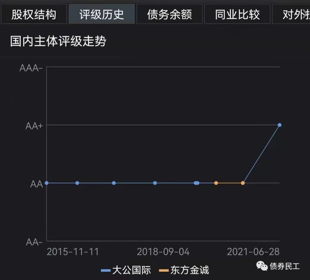 承德國控是承德市重要的公用事業(yè)、土地整理及投融資等業(yè)務(wù)的運(yùn)營主體,主營業(yè)務(wù)包括供熱業(yè)務(wù)、水務(wù)業(yè)務(wù)、土地整理業(yè)務(wù)、旅游業(yè)務(wù)和工程建設(shè)業(yè)務(wù)等。根據(jù)公開信息查詢,承德國控是承德市唯一的發(fā)行過債券的城投公司。承德國控的評(píng)級(jí)歷史如下圖,評(píng)級(jí)機(jī)構(gòu)包括東方金誠和大公國際。