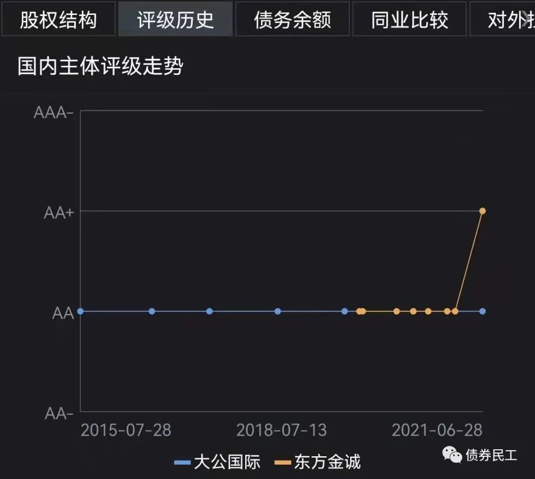 景德鎮(zhèn)陶文旅的實(shí)際控制人是景德鎮(zhèn)市國資委,主要是負(fù)責(zé)景德鎮(zhèn)市的基礎(chǔ)設(shè)施建設(shè)、保障房建設(shè)、國有資產(chǎn)經(jīng)營、酒店住宿、餐飲等業(yè)務(wù)。景德鎮(zhèn)陶文旅于2020年取得了上市公司南京音飛儲(chǔ)存設(shè)備(集團(tuán))股份有限公司的控制權(quán)。同時(shí),景德鎮(zhèn)市政府將部分國有資產(chǎn)劃入了景德鎮(zhèn)陶文旅。景德鎮(zhèn)陶文旅的評(píng)級(jí)歷史如下圖,評(píng)級(jí)機(jī)構(gòu)包括聯(lián)合資信和東方金誠。