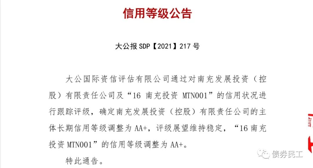 根據(jù)大公國際2021年6月29日出具的跟蹤評(píng)級(jí)報(bào)告,南充發(fā)展投資(控股)有限責(zé)任公司(以下簡稱“南充投資”)的主體信用評(píng)級(jí)上調(diào)至AA+。本次評(píng)級(jí)上調(diào)的原因可能包括:南充市經(jīng)濟(jì)穩(wěn)定發(fā)展、公司的重要地位及獲取政府補(bǔ)助的持續(xù)性、工投公司和交投公司股權(quán)劃入和主營業(yè)務(wù)區(qū)域?qū)I性較強(qiáng)等。