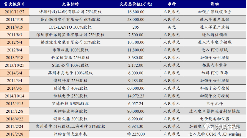 2016年、2017年為了切入聲學(xué)領(lǐng)域及蘋(píng)果聲學(xué)供應(yīng)鏈,控股蘇州美特、上海及惠州美律;2018年為切入光學(xué)領(lǐng)域,收購(gòu)光寶攝像頭事業(yè)部;