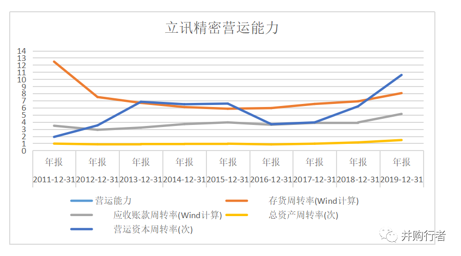 從下圖,我們可以看出經(jīng)過(guò)多年的并購(gòu),立訊精密的總資產(chǎn)周轉(zhuǎn)率、存貨周轉(zhuǎn)率、營(yíng)運(yùn)資本周轉(zhuǎn)率、營(yíng)運(yùn)資本周轉(zhuǎn)率都呈上升趨勢(shì),在被并購(gòu)標(biāo)的資產(chǎn)營(yíng)運(yùn)效率相比立訊精密來(lái)說(shuō)要低的情況下,可見(jiàn)并購(gòu)的整合使得被并購(gòu)標(biāo)的的運(yùn)營(yíng)效率得到很大的提高,