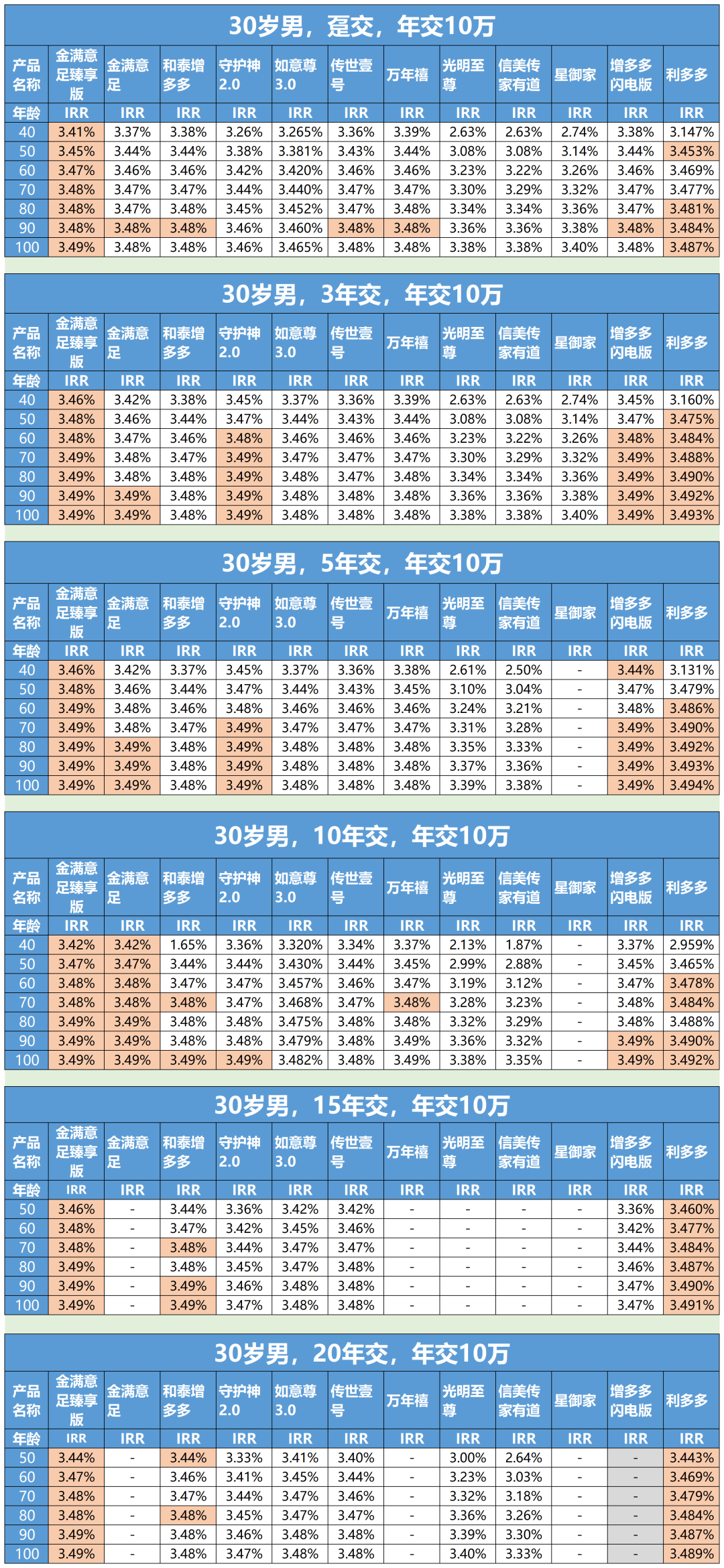 特別是金滿意足增額壽險(xiǎn),在12款產(chǎn)品中,任何繳費(fèi)期限、任何年齡段下,它的收益率都能排在前二。