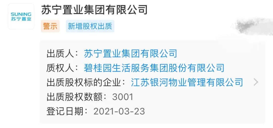 最新資料顯示,蘇寧置業(yè)將其所持江蘇銀行物業(yè)管理有限公司的全部股份,質(zhì)押給了碧桂園生活服務(wù)集團(tuán),后者是碧桂園服務(wù)(06098.HK)在內(nèi)地的主要運(yùn)營平臺公司。