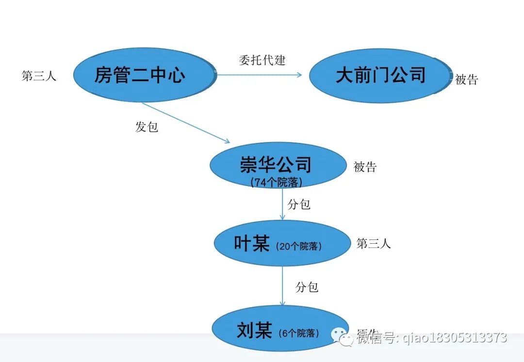 根據(jù)查明事實,發(fā)包人為房管二中心,大前門公司為代建單位,承包人為崇華公司,崇華公司將部分工程分包給了葉某,劉某與崇華公司、大前門公司均未簽訂施工合同,也未提供證據(jù)證明存在事實施工合同關系,故劉某與二被告不存在施工合同關系。