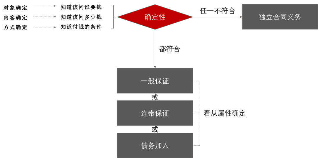 在上面我們學(xué)習(xí)了如何找主演,找到主演,那么就能排除獨立的合同義務(wù)——那么這個增信就只可能是一般保證、連帶保證5或者債務(wù)加入三種中的一種。