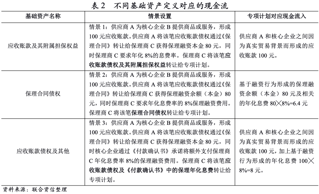 從基礎資產的角度看,資產支持證券的另外一端即為提供支持的“資產”,如何圈定基礎資產非常關鍵,基礎資產的定義不僅明確了專項計劃鎖定資產的法律關系,更確定了未來該類資產帶入的現金流,從而對于債項規模產生影響,此外基礎資產定義不同常常是受客觀條件所限而呈現不同的選擇,基于風險把控的角度應仔細分辨其成因,不同的基礎資產在交易安排上也需匹配相應確權文件以有效保障現金流信用質量。目前單一債務人證券化產品常見的基礎資產定義為“應收賬款及其附屬擔保權益”,但是也會有少量的“保理合同債權”“應收賬款債權及其他”等非常規的定義存在,下面用表格的形式給出情景假設。