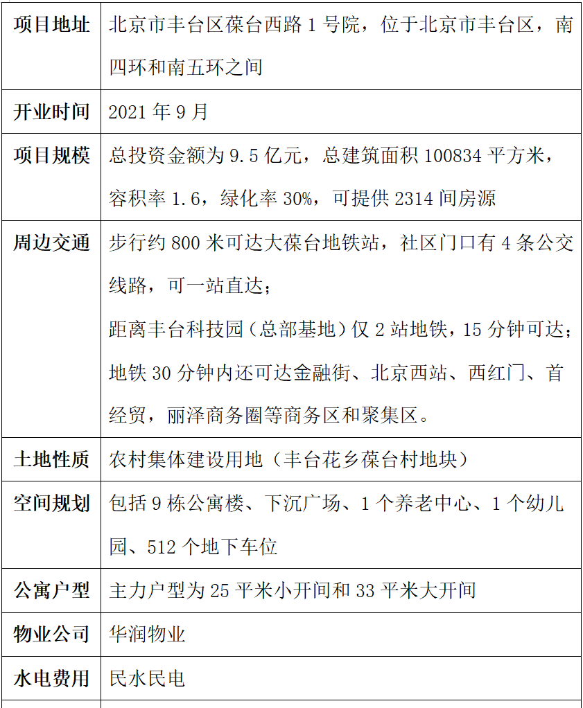 華潤有巢國際公寓社區(qū)總部基地店的項目土地,由豐臺區(qū)花鄉(xiāng)地區(qū)葆臺村提供,在2018年取得《北京市規(guī)劃和國土資源管理委員會鄉(xiāng)村建設(shè)規(guī)劃條件》和用地審批后,由華潤置地聯(lián)合平安不動產(chǎn)共同開發(fā),并由華潤置地旗下長租公寓品牌有巢運營。