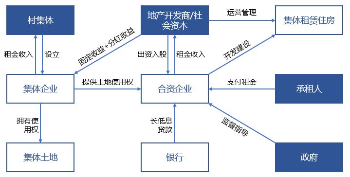該項目是村集體出讓土地經(jīng)營管理權(quán)與收益權(quán),聯(lián)營開發(fā)企業(yè)和社會資本進(jìn)行合作的模式。具體為:由村集體讓渡租賃住房項目經(jīng)營權(quán),社會企業(yè)出資進(jìn)行建設(shè)并獲得項目50年經(jīng)營權(quán)及收益權(quán),包括使用、經(jīng)營、管理、收益等權(quán)利(不包括占用權(quán)利),社會企業(yè)承擔(dān)建設(shè)費用和固定收益(保底),村集體獲得固定收益(保底)和分紅收益(遵照約定)。