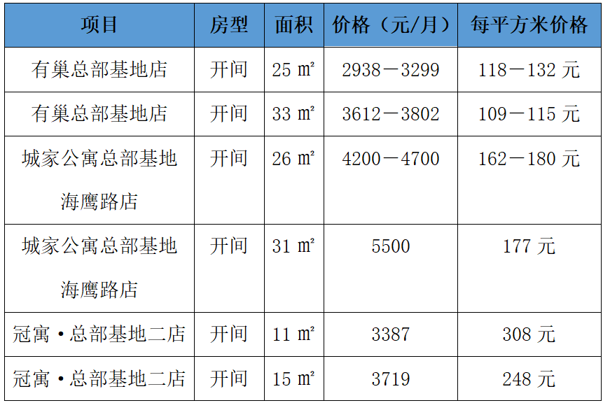 表2:有巢總部基地店及周邊同類型公寓租賃價格