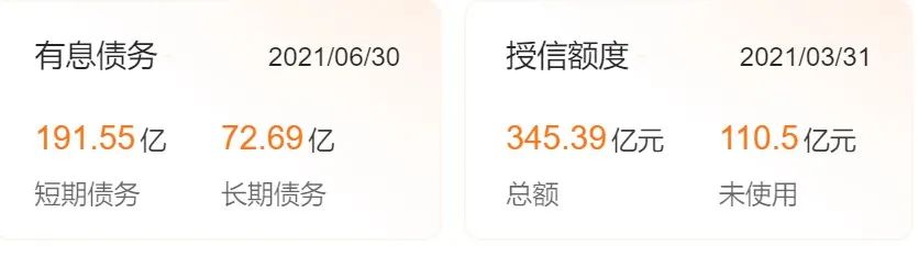 企業(yè)預(yù)警通顯示,截至2021年6月30日,雪松實業(yè)有息債務(wù)191.55億元,長期債務(wù)72.69億元。負(fù)債總額498.80億元,資產(chǎn)總計911.86億元,杠桿地產(chǎn)計算了下,資產(chǎn)負(fù)債率大概是54.7%。
