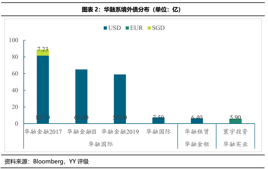 其中中國華融的二級子公司和三級子公司(除華融晉商)主要是作為SPV在境外發債,其境外債的最終債務人為中國華融的一級子公司。截至21年4月7日,華融系存續境外債合計219.60億美元、5.9億歐元及7.23億新加坡元,主要分布在華融國際、華融金租和華融實業三個一級子公司,其中華融國際目前的存續債規模最大。