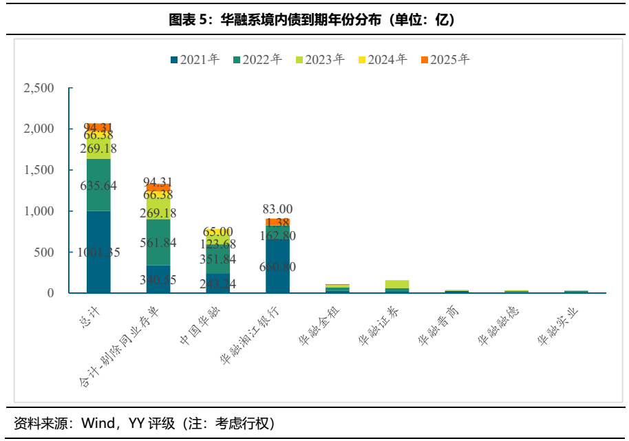 境內債來看,華融系存續境內債也集中在2021-2022年到期,2021年到期規模龐大,主因華融湘江銀行有660.80億的同業存單于2021年到期。在不考慮同業存單的情況下, 華融系2021-2023年分別有340.55億、561.84億和269.18億存續債到期,債務壓力很重。