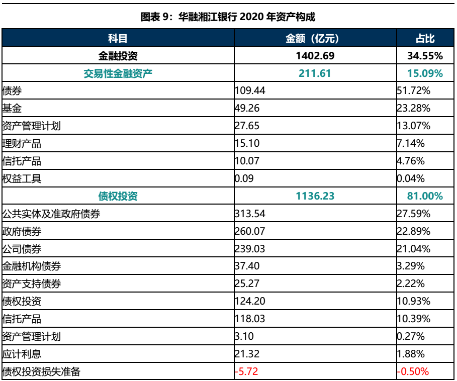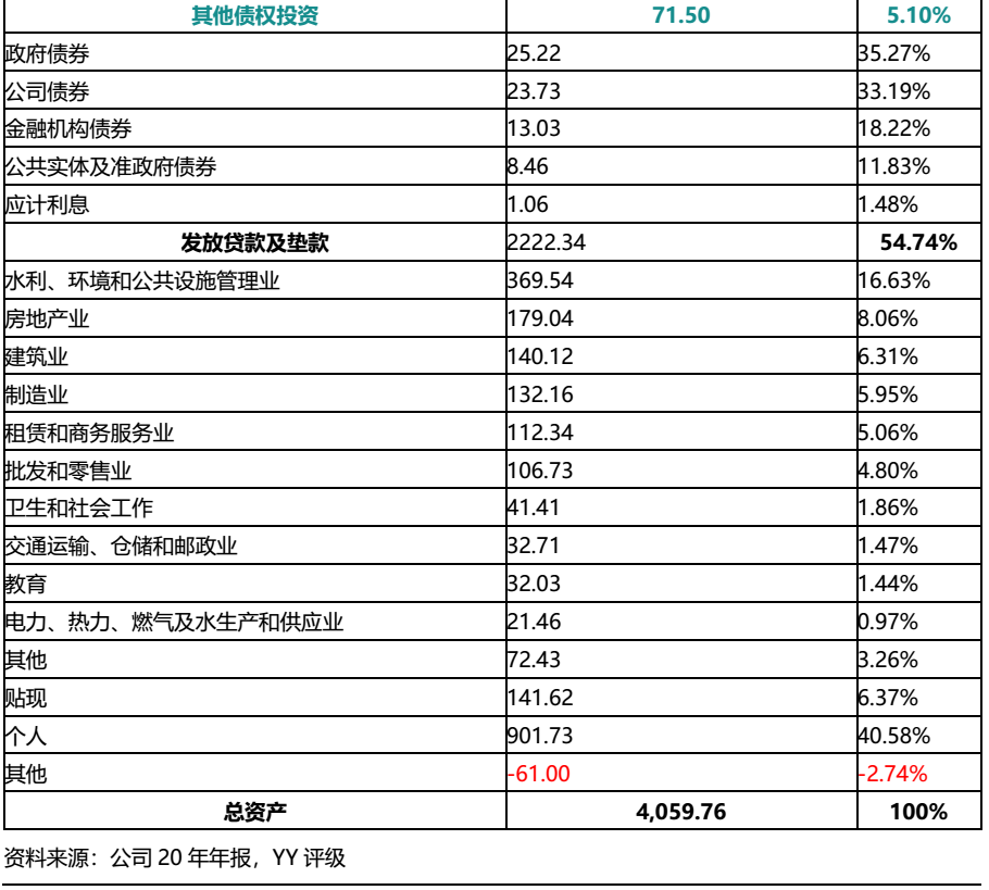 華融湘江銀行2020年資產總計4,059.76億元,主要由金融投資和發放貸款及墊款構成,二者合計占比89.29%。其中金融投資主要為債權投資,從明細來看,華融湘江銀行金融投資主要投向債券類資產;發放貸款及墊款則主要面向個人,水利、環境和公共設施管理業,房地產,建筑業和制造業等行業。