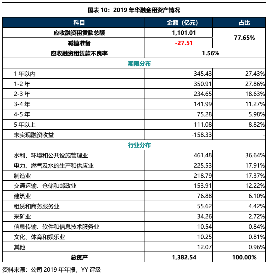 華融金租2019年資產總計1,382.54億元,主要為應收融資租賃款,其中應收融資租賃款不良率1.56%,較上年上升0.07%。從期限來看,公司應收融資租賃款以3年內為主,其中1年內應收融資租賃款占比27.43%,3年以上占比26.07%;行業來看主要集中在水利、環境和公共設施管理業,電力、燃氣及水的生產和供應業,制造業和交通運輸、倉儲和郵政業等。