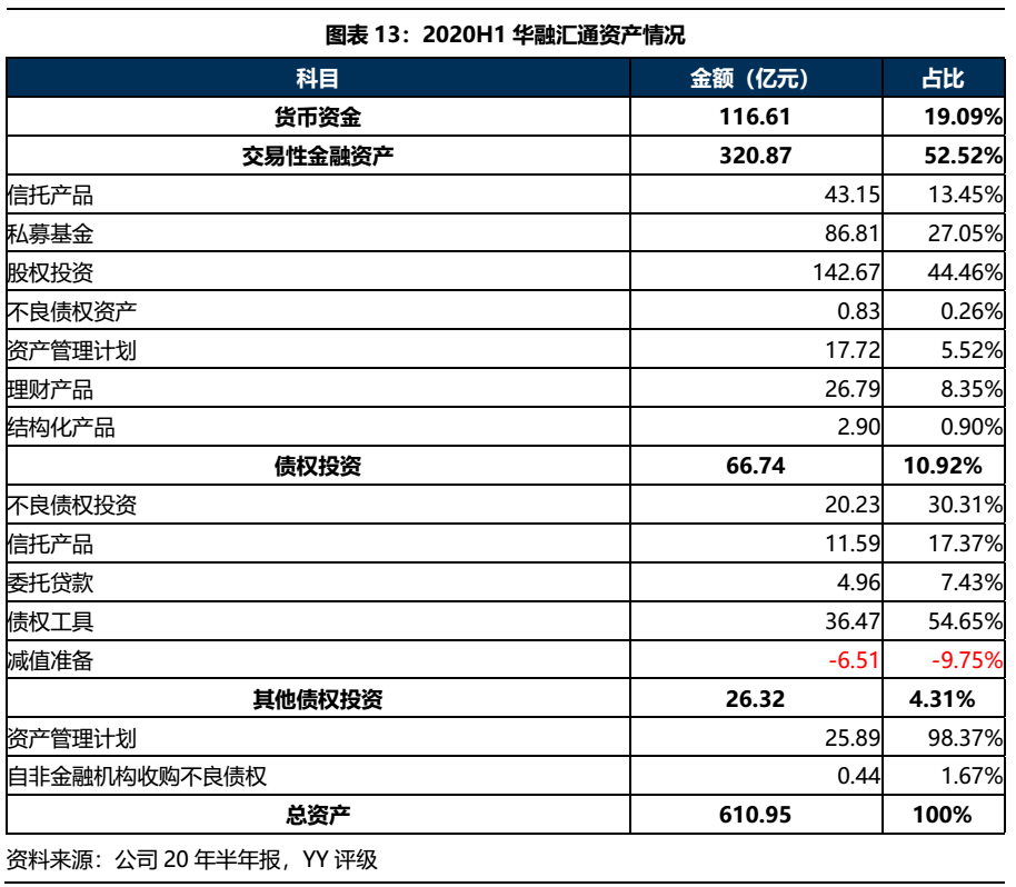 由于不再并表華融晉商,華融匯通資產規模2019年以來大幅下降,2020年6月末,公司總資產610.95億元,相較2018年總資產規模(1155.45億)近乎腰斬。從資產構成來看,華融匯通資產以貨幣資金、交易性金融資產和債權投資為主,交易性金融資產主要投向股權、私募基金和信托產品;債權投資則以債權工具、不良債權投資及其他權益投資的資產管理計劃為主,整體以投資類資產為主,需關注投資風險。