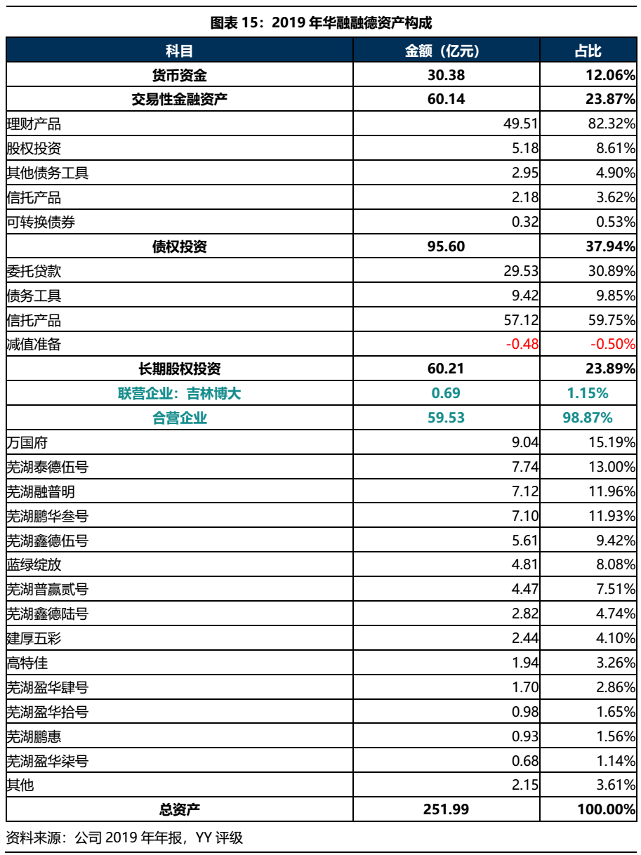 截至20年9月末,華融融德資產合計246.19億元,主要由貨幣資金、交易性金融資產、債權投資和長期股權投資構成,分別占比4.14%、21.36%、57.41%和15.11%。20年9月末,華融融德債權投資中關注類和不良類資產余額分別為8億和20.52億元,在總投資中占比3.92%和10.06%,其中關注類項目主要為鶴凱置業,不良類項目為泰禾集團和遠牟置業債權投資項目,此外還包括1筆小微企業主貸款資產包項目和1筆租房分期資產包項目,應收本金分別為1.65億和0.87億,于20年3月出現逾期。可以看到,隨著2018年融德香港轉出,華融融德資產配置向債權投資集中,關注投資風險。