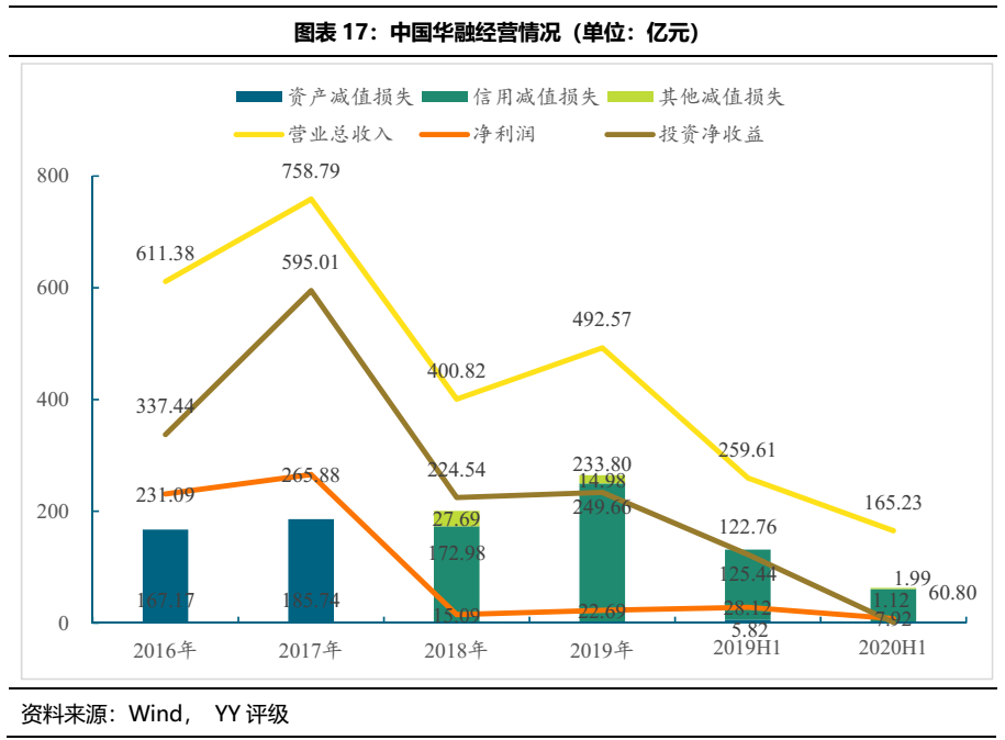 從經營來看,中國華融2018年營收大幅下降47.18%,凈利潤更是從265.88億元大幅縮水至15.09億元。2019年經營業績有所好轉,但相較于17年前大幾百的凈利潤仍是相距甚遠。16年以來中國華融各類減值損失呈增長趨勢,2019年合計264.64億元,對利潤侵蝕嚴重。