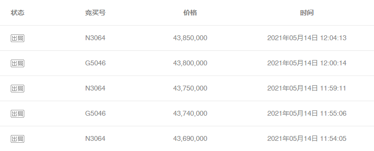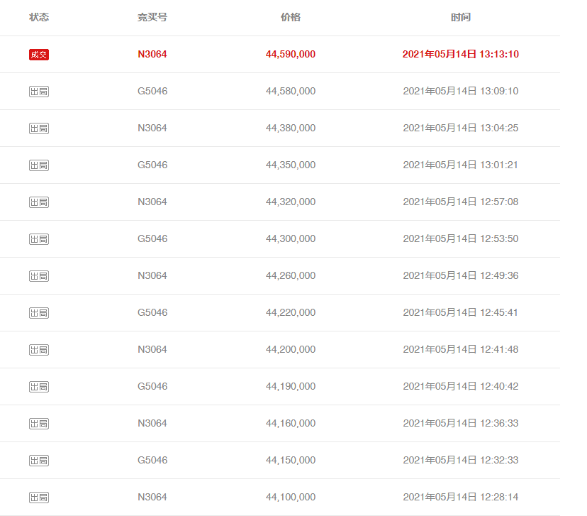 為表尊敬,本次參與競價的共有三位買家,分別是N3064、G5046和V5244,無論背后身份如何,在這里都尊稱一聲“大佬”。