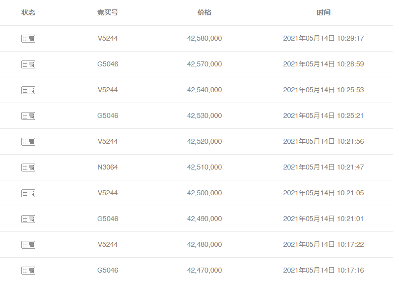 霄8這場戰役,率先在今天上午9點55分由N大佬打響第一槍,4200萬報上底價;2分鐘后,另一位大佬G登場,謹慎地加價1萬,試試水。