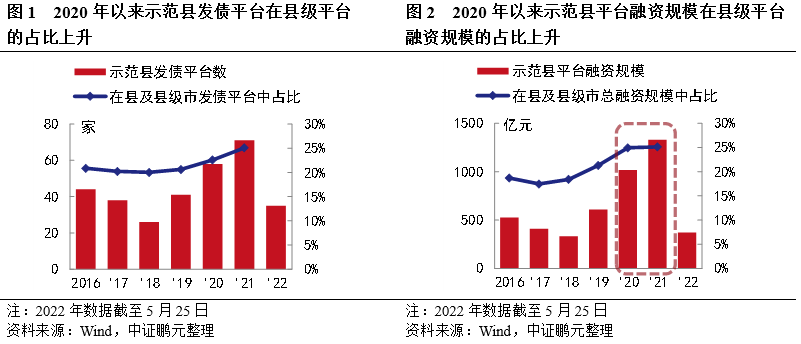 盡管《指引》審核的是項(xiàng)目,而非發(fā)債企業(yè),但對(duì)縣及縣級(jí)市、特別是示范縣城投平臺(tái)發(fā)債的提振作用是不言而喻的。根據(jù)統(tǒng)計(jì)數(shù)據(jù),2021年示范縣發(fā)債平臺(tái)數(shù)量和融資規(guī)模較2019年分別增長(zhǎng)42%和118%。2022年5月,國(guó)務(wù)院發(fā)文,繼續(xù)加大縣城城鎮(zhèn)化建設(shè)的政策支持力度,并將政策提升至國(guó)家層面??梢灶A(yù)見(jiàn),在未來(lái)縣一級(jí)特別是示范縣發(fā)債將會(huì)有更大突破。