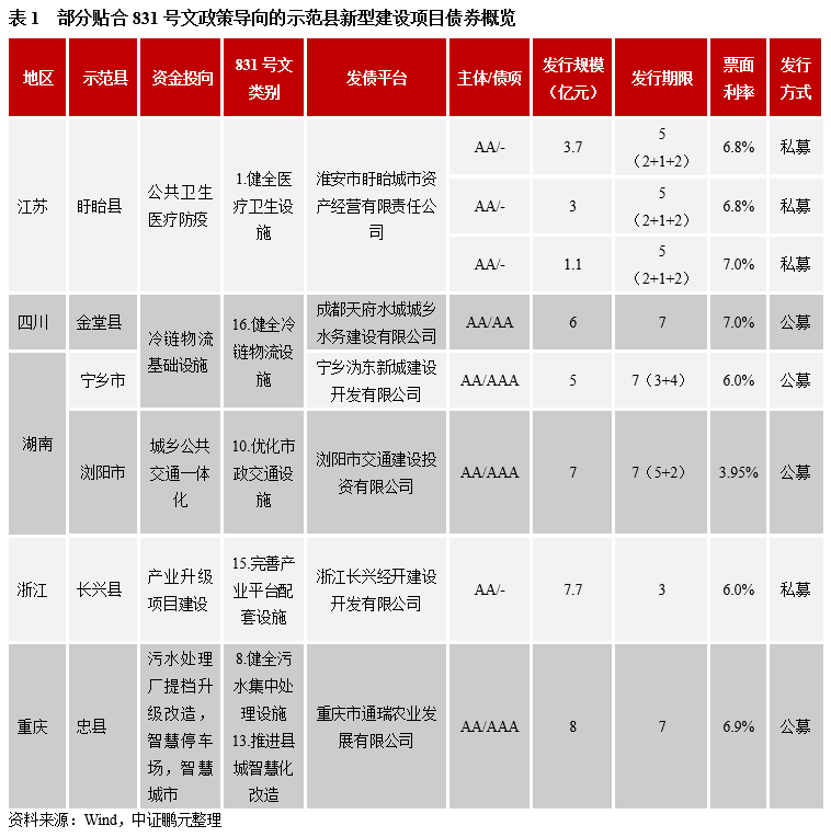 2020年5月發(fā)改委《國(guó)家發(fā)展改革委關(guān)于加快開展縣城城鎮(zhèn)化補(bǔ)短板強(qiáng)弱項(xiàng)工作的通知》(發(fā)改規(guī)劃〔2020〕831號(hào))(以下簡(jiǎn)稱“831號(hào)文”)將120個(gè)縣及縣級(jí)市列入縣城新型城鎮(zhèn)化建設(shè)示范縣(以下簡(jiǎn)稱“示范縣”),隨即同年8月,發(fā)改委辦公廳發(fā)布《縣城新型城鎮(zhèn)化建設(shè)專項(xiàng)企業(yè)債券發(fā)行指引》(以下簡(jiǎn)稱“《指引》”),對(duì)符合扶持產(chǎn)業(yè)的建設(shè)項(xiàng)目予以政策支持。