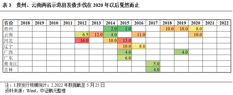2.貴州、云南兩省,盡管地區(qū)經(jīng)濟(jì)亦偏弱,但因前期地方經(jīng)濟(jì)發(fā)展戰(zhàn)略吸引到了全國(guó)的金融資源,示范縣前期發(fā)債步伐明顯快速挺進(jìn),但在2020年之后戛然而止,與地區(qū)債務(wù)率偏高、近兩年風(fēng)險(xiǎn)暴露有關(guān);河北、遼寧、廣西、廣東、黑龍江、吉林六省近三年也未有示范縣平臺(tái)發(fā)債。