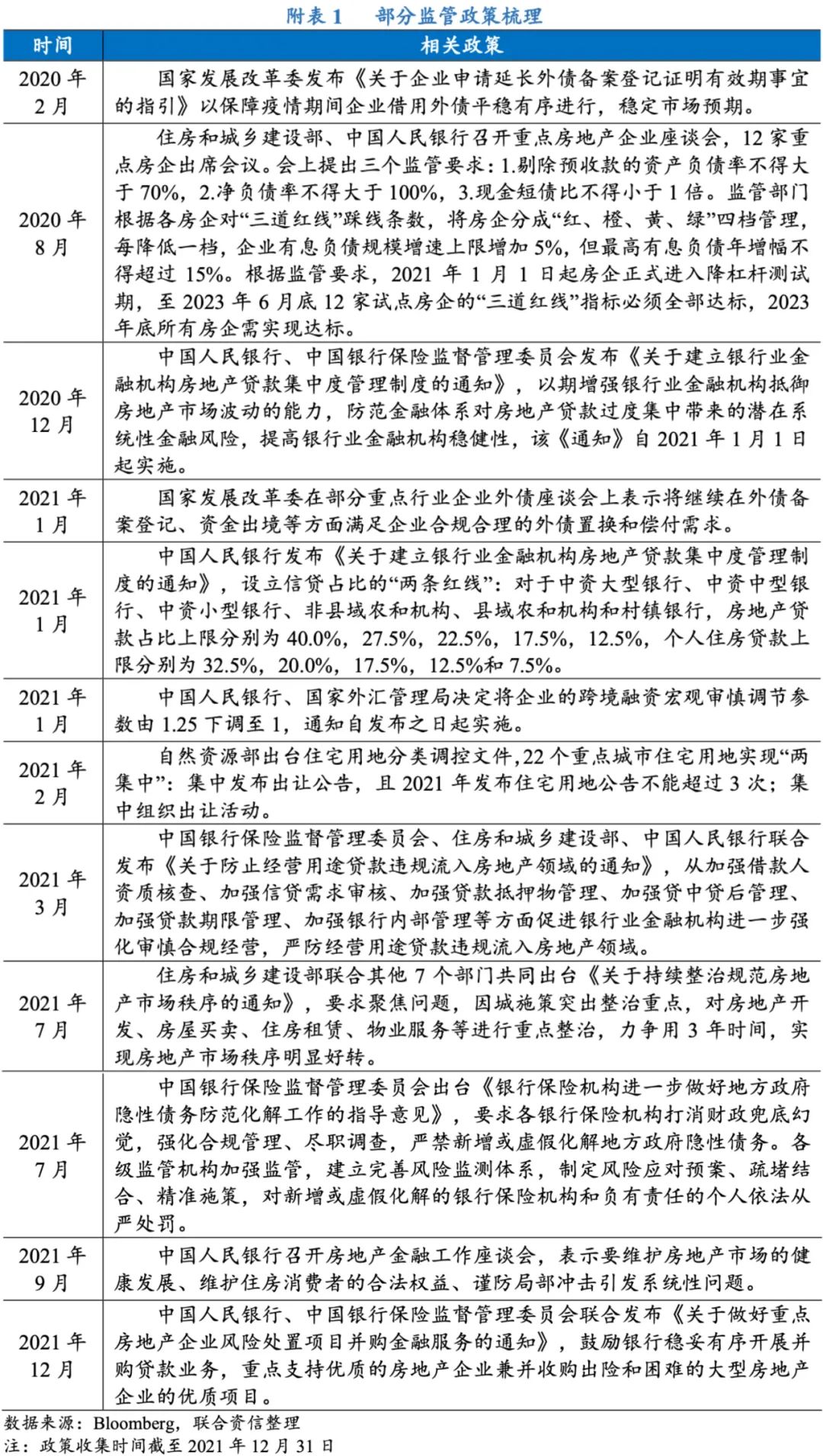 2021年12月,中國人民銀行聯合銀保監會共同發布《關于做好重點房地產企業風險處置項目并購金融服務的通知》,鼓勵優質的房地產企業兼并收購存在資金周轉困難的大型房地產企業的優質項目,試圖化解部分高杠桿房地產流動性危機、防范信用風險進一步外溢。中國人民銀行行長易綱表示在穩妥化解個別企業風險的同時將滿足房地產企業的正常融資需求,引導房地產市場形成新發展模式。自房地產企業集中暴雷以來,中國央行及地方政府已先后多次向外界傳達將控制個別企業風險、阻斷其擴散的決心,試圖安撫市場情緒,考慮到當前仍有較多房地產企業出現信用風險事件的概率較高,監管層或在未來一段時間內放松部分融資或資金管理要求,以幫助房地產企業減輕短期流動性壓力、降低再融資難度,部分高杠桿企業在獲得喘息后有望通過進行新一輪融資以避免出現集中違約及可能的一系列連鎖反應,中資美元債市場一級市場發行表現或將被明顯修復。