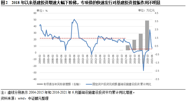 2004年以來,我國基建投資增速波動雖然較大,但整體保持較高速度增長,2004-2017年增長中樞達21.95%。受淡化GDP激勵機制、財政約束增大及城投債務融資管控等因素影響,2018年以來我國基建投資增速快速下滑,2018年至2021年6月基建投資增速中樞僅為3.47%。2018年7月,國務院常務會議提出加快1.35萬億專項債發行和使用進度,更好地發揮專項債券對穩投資、擴內需、補短板的作用,在推動在建基礎設施項目上早見成效。2018年以來,我國新增專項債限額和實際新增專項債規模逐年提高,受疫情影響提振經濟的需求,2020年專項債計劃新增限額3.75萬億元,實際新增3.60萬億元,但基建投資增速的仍持續低位運行( 2021年上半年基建投資增速大幅反彈主要是受基數影響,2021年6月基建投資累計增速已下滑至7.15%)。