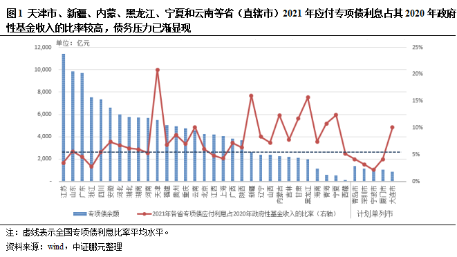 天津、新疆、黑龍江、寧夏等省份(直轄市)和計劃單列市中的大連市2021年應付專項債利息占其2020年政府性基金收入的比率較高;隨著專項債規模逐年增長,疊加房地產政策長期調控和城市土地資源的逐漸減少,部分省份還本付息的壓力將逐漸加大
