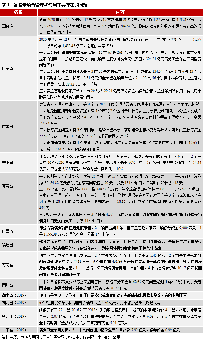 今年6月7日,審計署發布《國務院關于2020年度中央預算執行和其他財政收支的審計工作報告》,其中對政府債務風險審計調查情況指出,政府專項債仍存在重發行、輕管理的問題。今年7月以來,各省陸續發布2020年度省級預算執行和其他財政收支的審計工作報告,多個省份披露了2020年其專項債使用存在的問題,主要包括如下方面:(1)資金管理使用不嚴格,部分地區將專項債資金用于發放人員工資、差旅費等經常性支出,或者購買理財、出借其他單位及用作其他項目建設等;(2)專項債項目建設進度緩慢,部分項目甚至無法實施,部分專項債資金用于投向無收益的項目;(3)債券資金長期閑置,因項目前期準備不充分、規劃調整等,部分債券資金長期閑置在國庫或者項目單位,最長閑置時間甚至超過1年,未及時形成實物工作量。