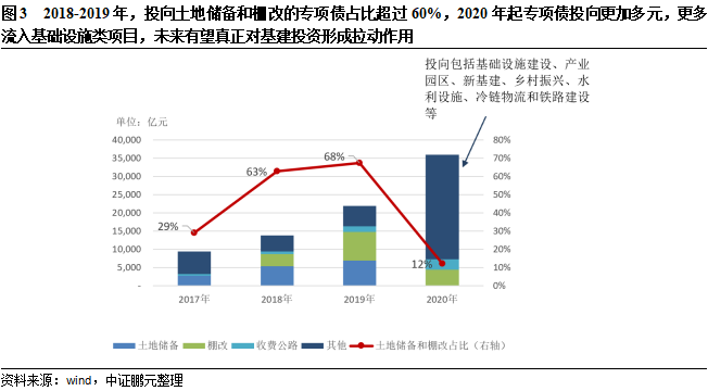 第一個方面是,2017年政策鼓勵地方政府積極探索有一定收益的公益性事業領域放行專項債券,同年6月和7月分別發布土地儲備和收費公路專項債的管理辦法;2018年4月,財政部新增棚改專項債管理辦法,自此土地儲備和棚改成為專項債的主要投向。經統計,2018-2019年合計投向土地儲備和棚改的專項債規模均超過當年新增專項債總額的60%,由于土地儲備和棚戶區改造的相關投資并不計入基建投資,使得專項債發行規模的快速提升并未帶動基建投資的增長。2019年9月,國務院常務會議明確“專項債資金不得用于土地儲備和房地產相關領域、置換債務以及可完全商業化運作的產業項目”,但此時2019年專項債發行已接近尾期,投向未受到影響,但2020年投向土地儲備的專項債驟降至0,投向棚改項目的專項債規模亦大幅減少,占當年新增專項債的12%左右,更多項目投入交通基礎設施建設、產業園區建設、新基建、生態環保、水利建設和軌道交通等領域。至此,專項債投資領域呈現多元化且真正投入各類基建項目。