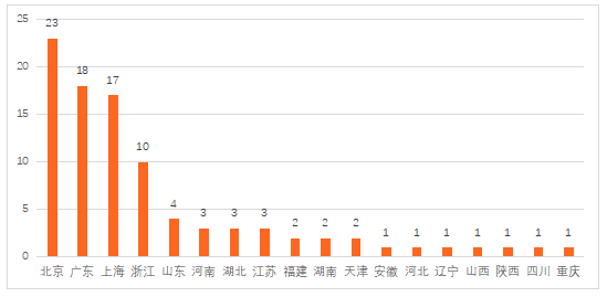 據零壹智庫不完全統計,截至2021年4月23日,債權撮合類平臺約有40個,其中北京注冊平臺最多,有14個,其次是上海8個,2個區域合計占比55%。