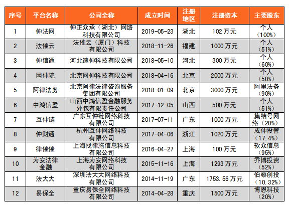 法律服務類平臺約有12個,平臺綜合運用互聯網技術、法律手段和金融工具,為客戶提供網絡仲裁、司法處置等服務。
