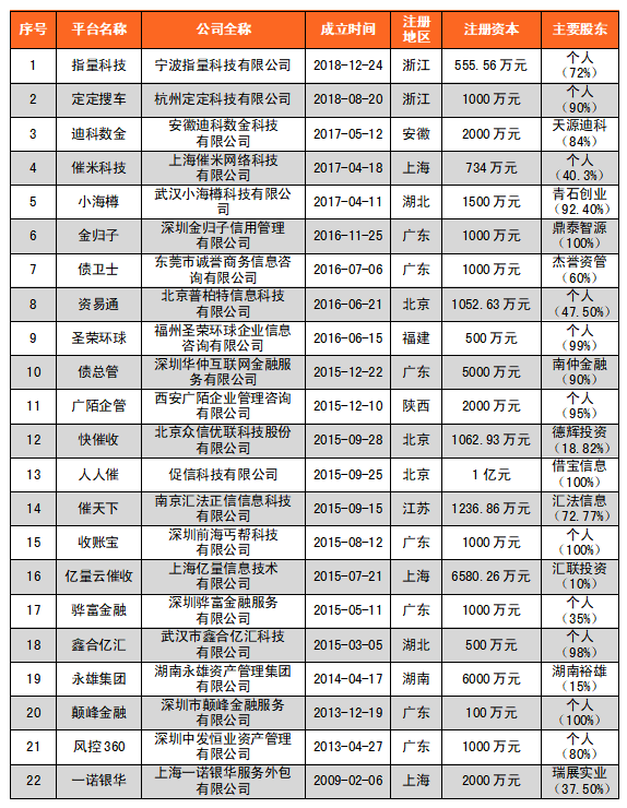 在線催收類平臺約有22個,其中廣東注冊平臺最多,有7個,其次是上海3個,2個區域合計占比45.5%。永雄集團于2018、2019年兩次赴美上市,卻均以失敗告終。