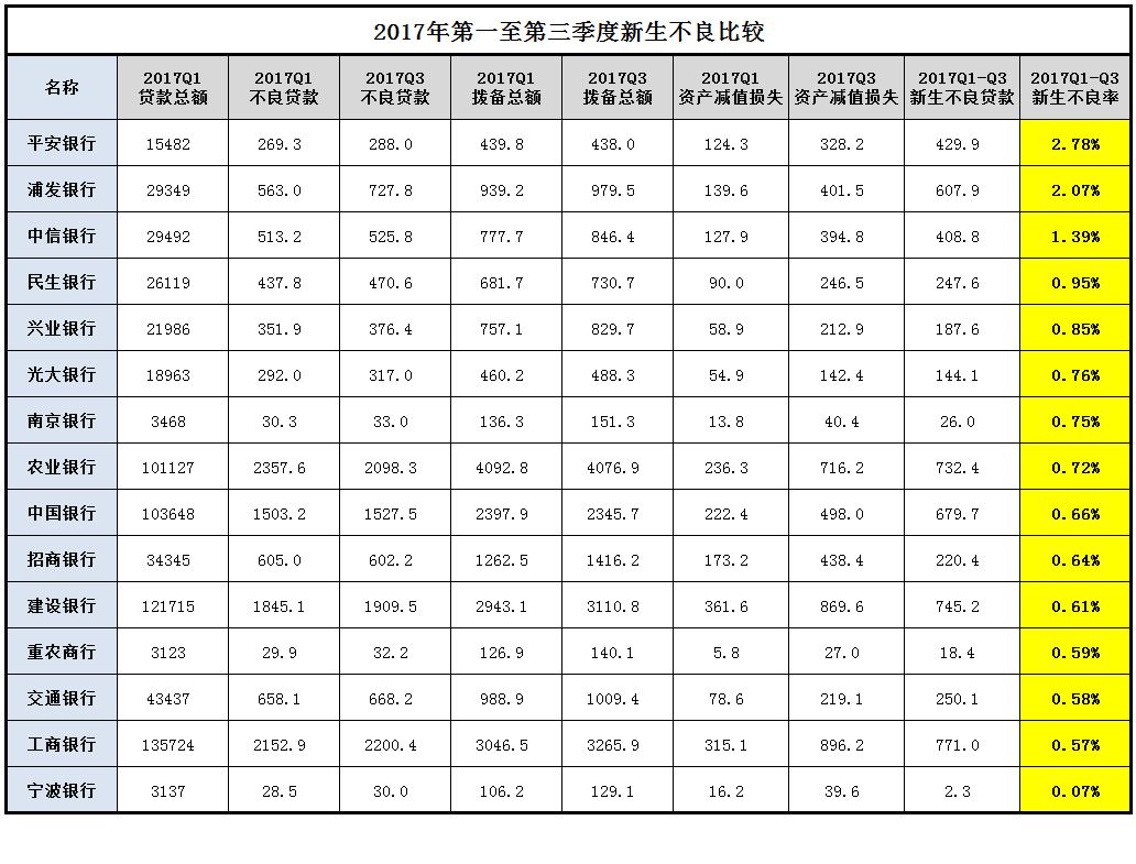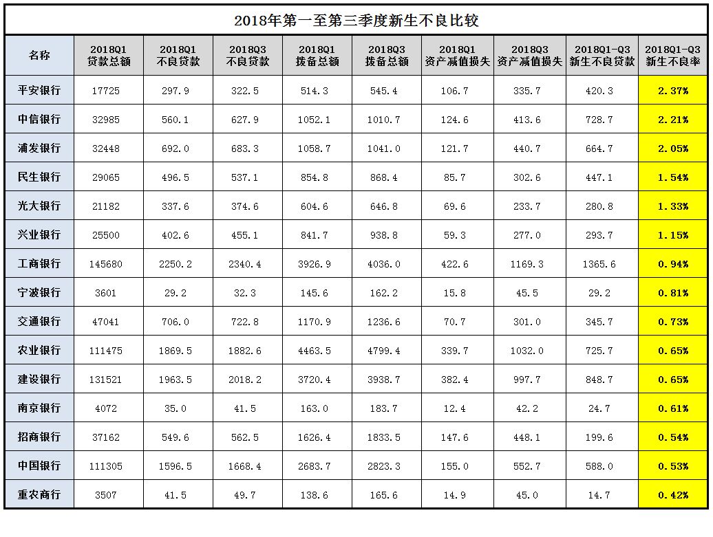 各銀行都已經出完了2018年三季報,我們也對一些銀行進行了解讀,應該說行業數據整體看還是不錯的,還有進一步好轉的跡象。但是在非標轉標、表外轉表內、貸款占比普遍提高,以及監管部門進一步嚴格要求不良口徑的情況下,從數據上看資產質量拐點又出現一些反復。由于不少銀行根據新的會計準則在年初一次性計提了一筆撥備,對新生不良的同比計算會造成干擾。我們截取一季度至三季度的數據同比分析新生不良,也即銀行在這個期間的信用成本。下面對我們重點關注的15家上市時間長投資價值不錯的銀行進行分析,歡迎大家一起討論。