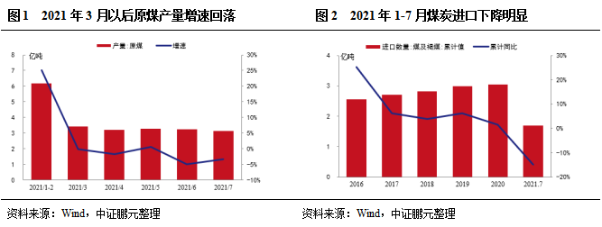 2021年1-7月原煤產(chǎn)量保持小幅增長,但產(chǎn)地供給持續(xù)受限。2021年1-7月,全國原煤產(chǎn)量22.6億噸,同比增長4.9%,比2019年同期增長4.8%。具體來看,2021年1-2月,全國原煤產(chǎn)量6.18億噸,同比增長25%,主要系受冷冬及下游需求旺盛影響,產(chǎn)地煤礦開工率高,同時2020年年初受疫情影響原煤產(chǎn)量偏低。3月份以后,晉陜蒙主產(chǎn)地安全環(huán)保檢查頻繁,包括山西省開展持續(xù)到年底的煤礦安全大排查,陜西榆林煤礦超產(chǎn)檢查,山西晉北地區(qū)中央環(huán)保組督查等,此外內(nèi)蒙古反腐、煤管票持續(xù)。2021年3-7月,全國原煤產(chǎn)量同比增速分別為-0.2%、-1.8%、0.6%、-5%和-3.3%,煤炭實際供給持續(xù)受限。進口方面,2021年1-7月煤炭進口數(shù)量為1.7億噸,較去年同期下降15%,煤炭進口整體收緊。