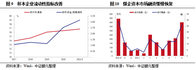 2021年6月末,樣本企業(yè)平均資產(chǎn)負債率為56.81%,明顯低于行業(yè)平均水平(66.14%),較2020年末變動不大,樣本企業(yè)資本結(jié)構(gòu)仍未得到有效改善。2021年6月末,樣本企業(yè)貨幣資金/短期債務(wù)為3.15,較上年末水平上升0.62,樣本企業(yè)流動性指標繼續(xù)邊際改善。此外,2021年8月煤企債券市場共發(fā)行26期債券,融資規(guī)模超過400億元,已接近去年10月份的發(fā)行規(guī)模,行業(yè)融資逐漸回暖。預(yù)計隨著煤價繼續(xù)維持高位,樣本企業(yè)盈利將持續(xù)維持較高水平,經(jīng)營活動現(xiàn)金流持續(xù)凈流入,償債壓力邊際改善。