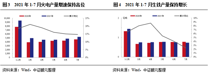 電力方面,2021年1-7月火電發(fā)電量為3.35萬億千瓦時,同比增長14.7%,一方面2021年以來我國社會用電量保持較高增速,1-7月社會總用電量為4.71萬億千瓦時,同比增長15.6%。另一方面,受氣候影響,水力發(fā)電減少,1-7月水電發(fā)電量同比僅增長1.4%。庫存方面,2021年7月末國內(nèi)重點電廠煤炭庫存量5,067萬噸,較去年同期下降42.60%,2021年1-7月庫存可用天數(shù)均在20天以下,7月可用天數(shù)僅11天,較去年同期減少12天。