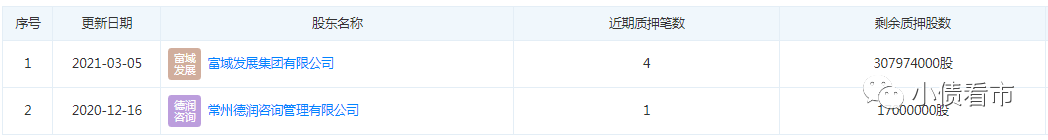 據(jù)最新數(shù)據(jù)顯示,富域發(fā)展和常州德潤質(zhì)押新城控股股份分別3.08億和1700萬股,股權(quán)質(zhì)押率分別為22.35%和12.34%,可以看出質(zhì)押率較高。